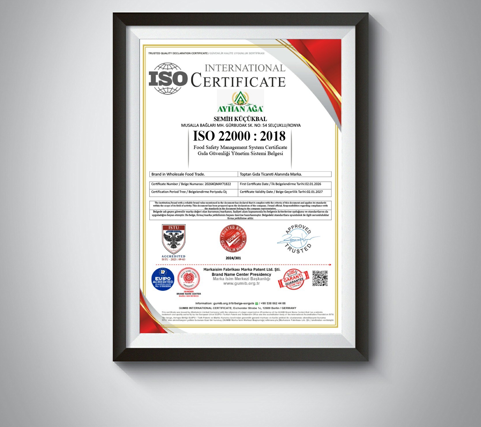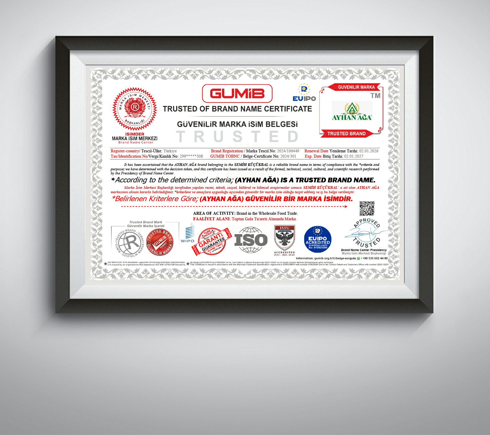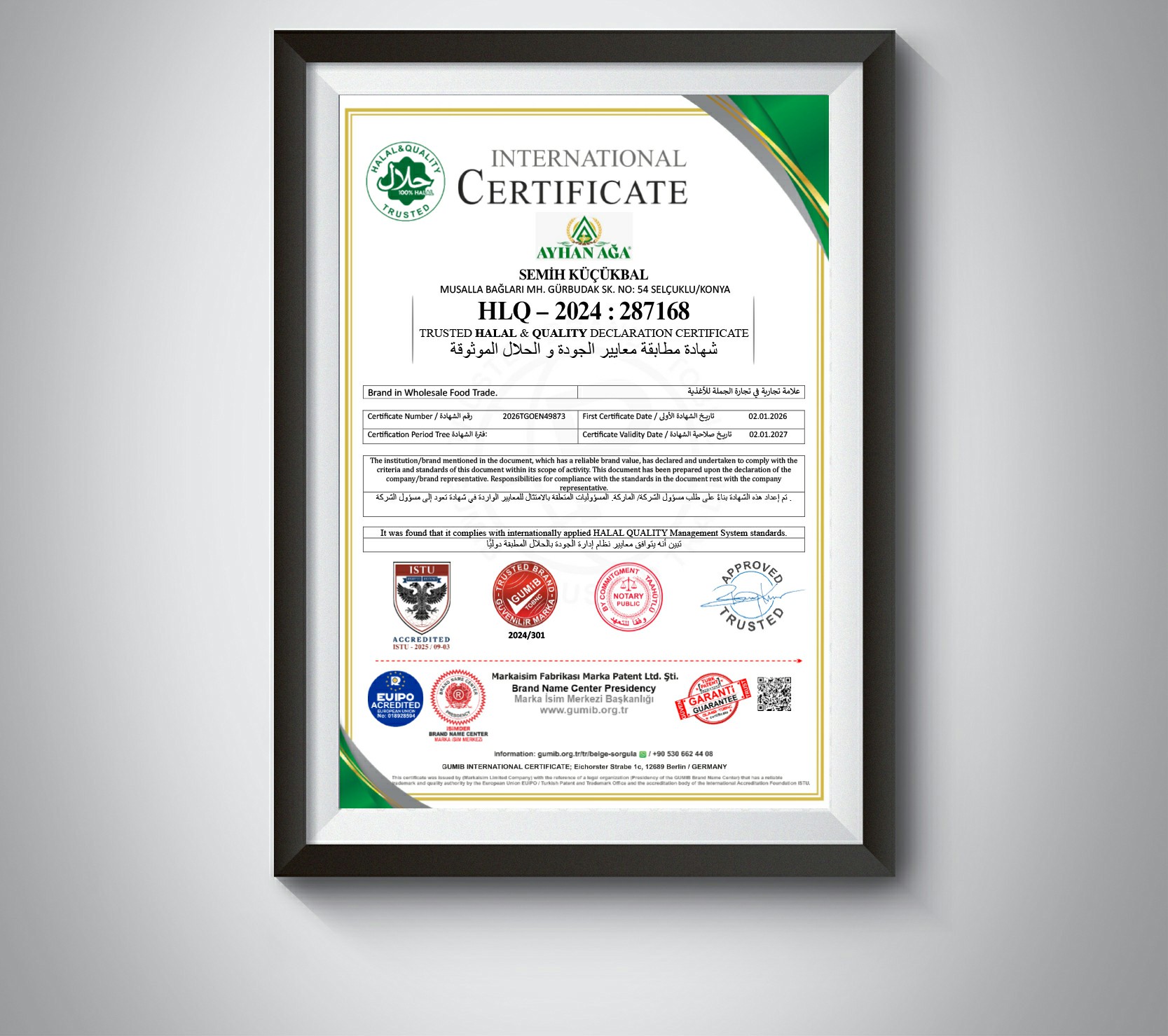 Uluslararası Helal Standartlarına Uygunluk Ayhan Ağa olarak, ürünlerimizin tamamını İslami usullere ve uluslararası Helal standartlarına uygun şekilde üretiyoruz. Güvenilir ve helal gıda anlayışımızı, aldığımız bu tescilli sertifika ile taahhüt ediyoruz.